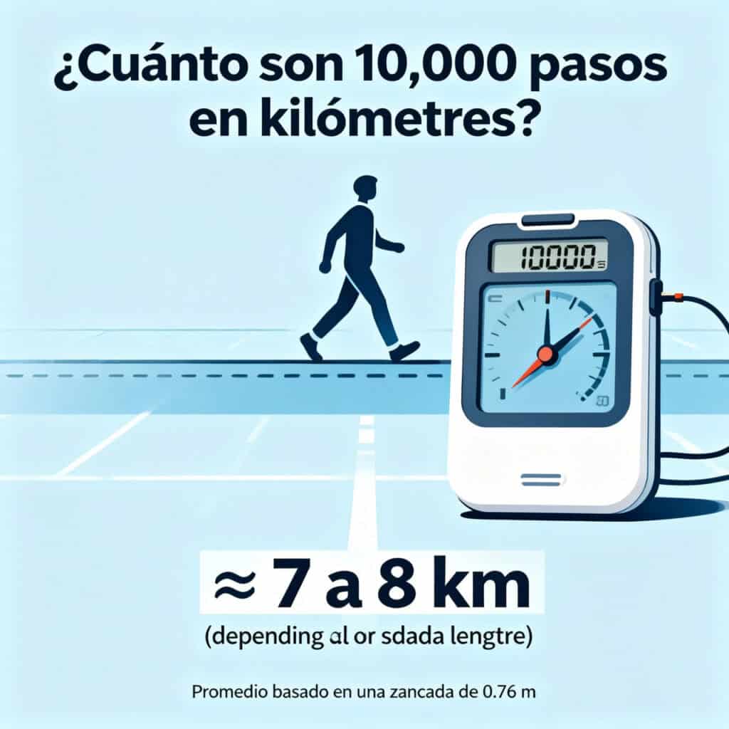 Promediando los datos, la equivalencia más aceptada sitúa 10000 pasos ≈ 7,5 kilómetros, una distancia cercana a una caminata continua de 90 a 100 minutos a paso moderado.