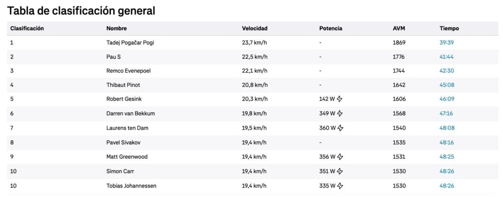 • Pogačar: 6,98 W/kg durante 39:50 min, velocidad media 23,5-26,2 km/h en la parte final