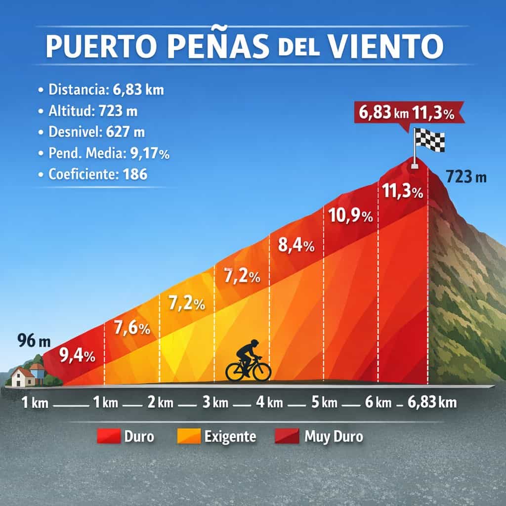 Estos datos sitúan al Peñas del Viento por encima en dificultad de puertos míticos como el Puerto de Urkiola o Peña Cabarga en términos de coeficiente de esfuerzo relativo. La clave de su dureza no es la longitud, sino la constancia. Una media superior al 9% durante casi 7 kilómetros significa que los descansos son prácticamente inexistentes.