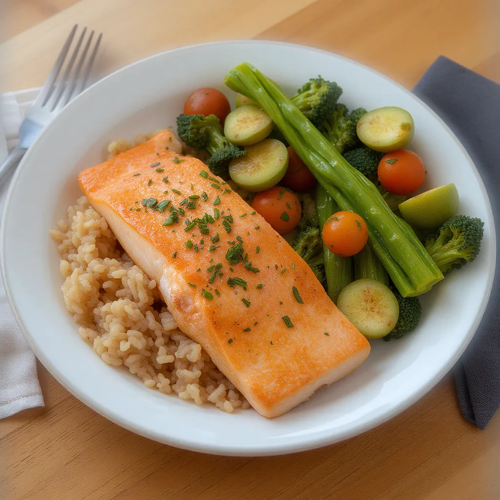 - Comida: arroz integral con salmón y verduras al vapor.