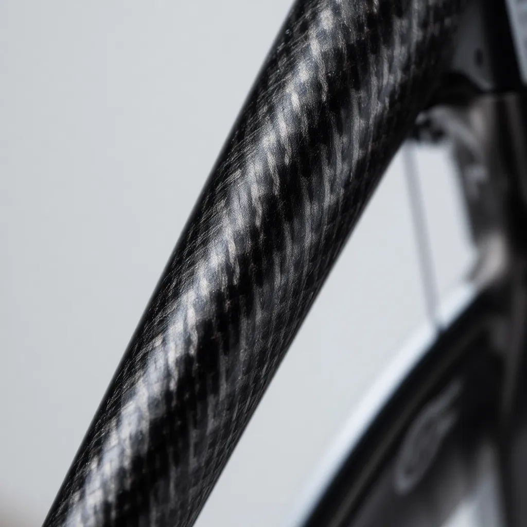 La fibra de carbono ha sustituido casi por completo al aluminio en gamas altas. Su estructura trenzada con resinas epoxi permite crear formas aerodinámicas, resistentes y ultraligeras.