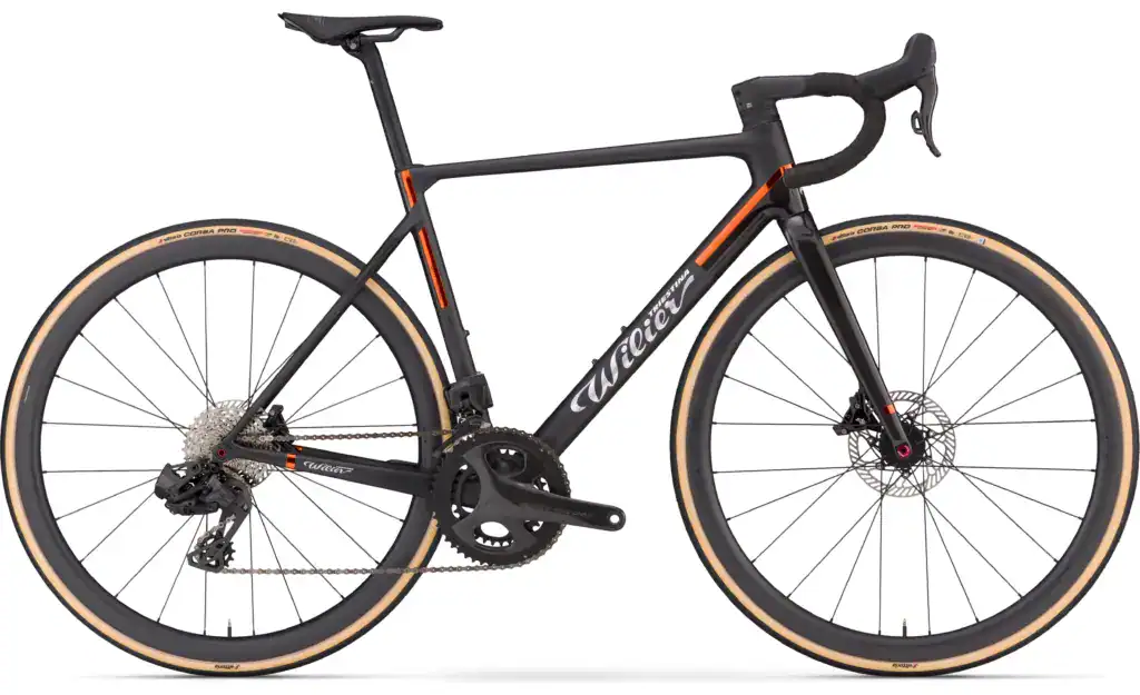 La Wilier Verticale SLR combina ligereza con estética artesanal. Fabricada con tecnología de fibras de carbono de alto módulo y montada con el grupo Campagnolo Super Record Wireless 2x12, su peso de 6,57 kg la convierte en una escaladora refinada, elegida por equipos como el Groupama FDJ.