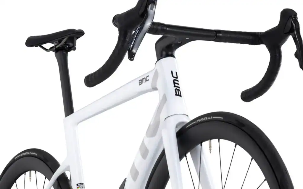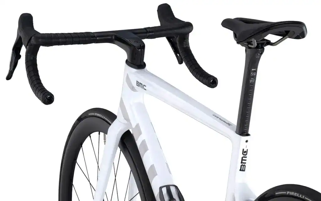El guiado de cables es completamente interno, con el manillar ICS Carbon Evo como pieza central de la limpieza visual y la performance aerodinámica. Según BMC, la eficiencia total del “sistema bici-ciclista” mejora un 2,2% respecto a la SLR anterior, mientras la bici sola es un 12% más rápida frente al viento.