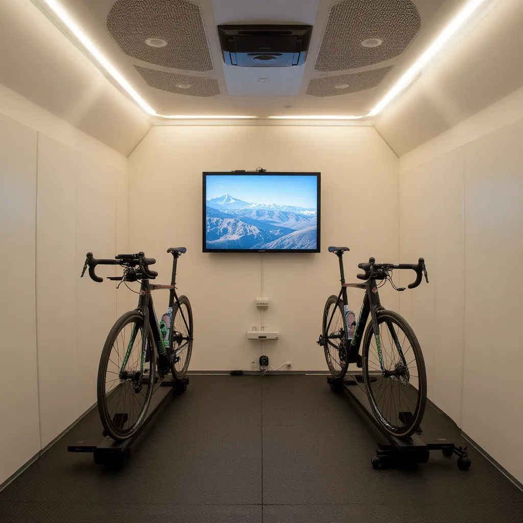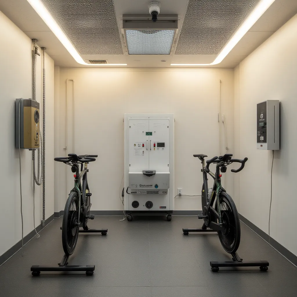Por ejemplo, la Cámara de entrenamiento en hipoxia Biolaster A100 permite ejercicios con dos ciclistas simultáneamente, ajustando el porcentaje de oxígeno entre 14% y 15%.(Biolaster)