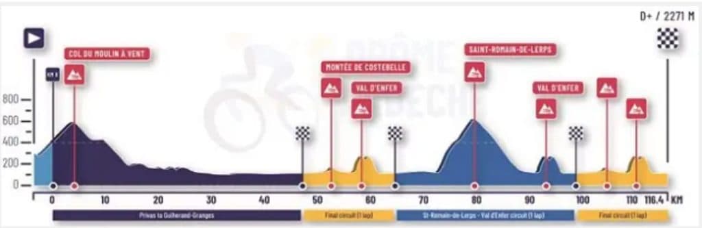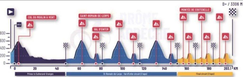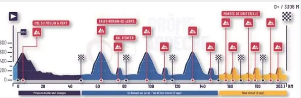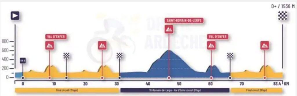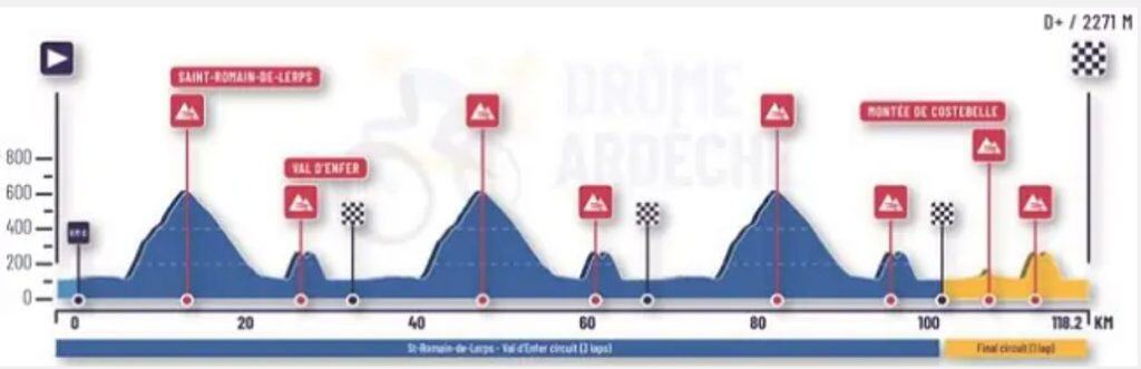 - Saint-Romain-de-Lerps: 6,8 km al 7,3%, que se ascenderá tres veces aproximadamente a mitad de carrera. Es un puerto que forma parte de muchas clásicas francesas y tiene rampas sostenidas.