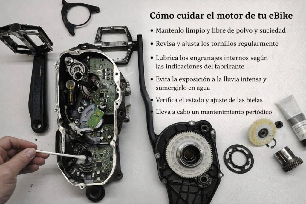 A menudo, los ciclistas acuden al taller temiendo que el motor se ha roto porque escuchan crujidos al pedalear. En un gran porcentaje de los casos, cómo cuidar el motor de tu ebike implica simplemente apretar los tornillos que sujetan el motor al cuadro. Estos tornillos deben apretarse al par especificado por el fabricante (usualmente entre 20 y 25 Nm) con una llave dinamométrica.