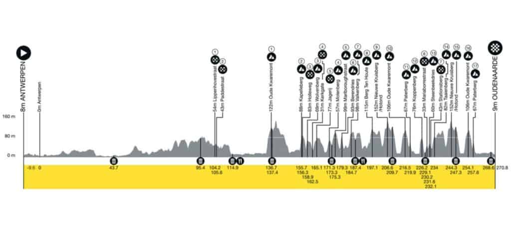 El Tour de Flandes es una de las carreras más espectaculares del calendario, con un recorrido que incluye famosos muros y tramos de adoquines como: