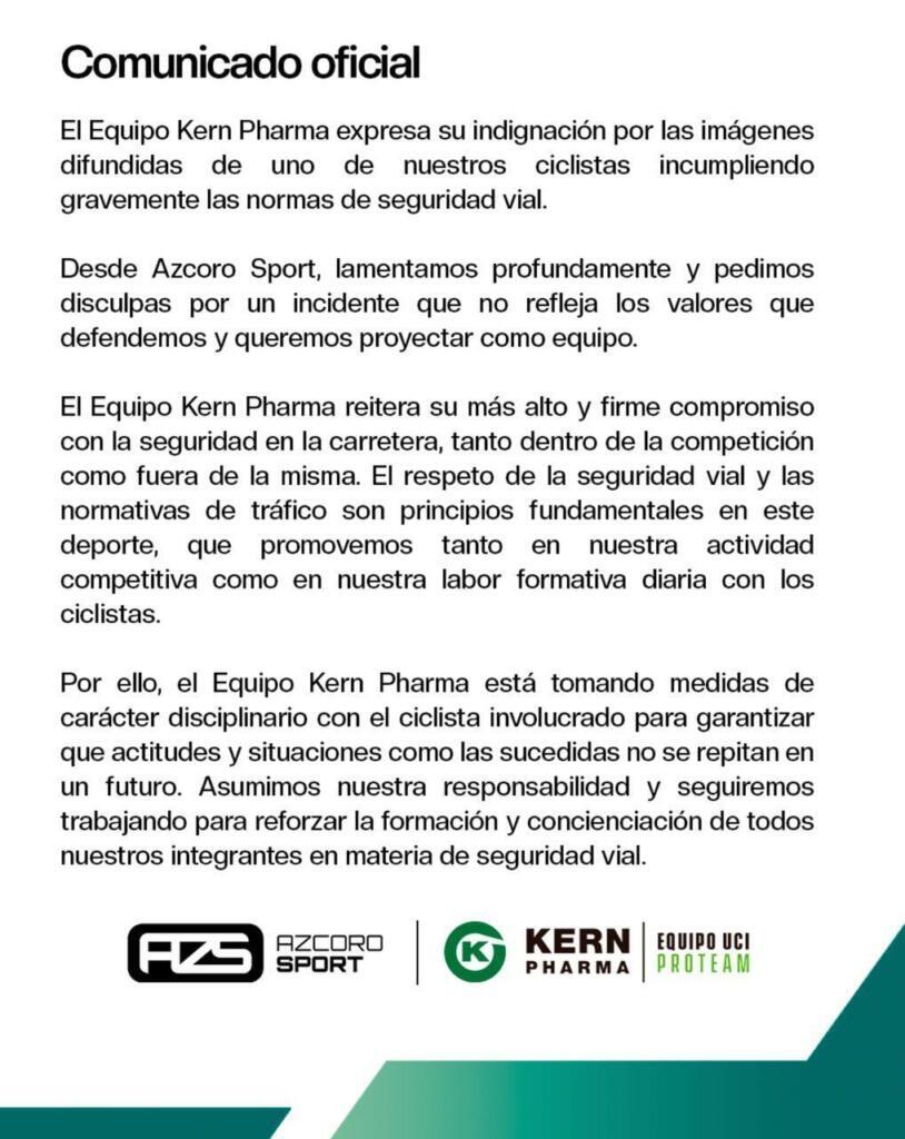 Tras la avalancha de críticas, el equipo Kern Pharma reaccionó emitiendo un comunicado oficial en el que expresó su "indignación por las imágenes difundidas". En la nota pidieron disculpas a la opinión pública y recalcaron que la acción no refleja los valores de la escuadra navarra gestionada por Azcoro Sport.