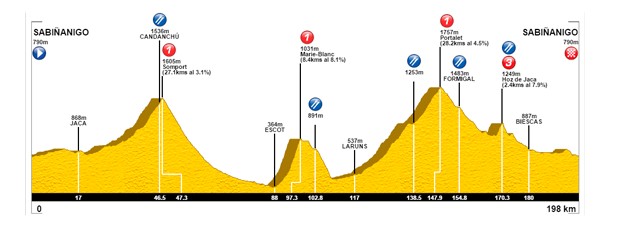 La primera gran ascensión comienza en el kilómetro 30 de la marcha, tras haber pasado localidades emblemáticas como Villanúa y Canfranc.