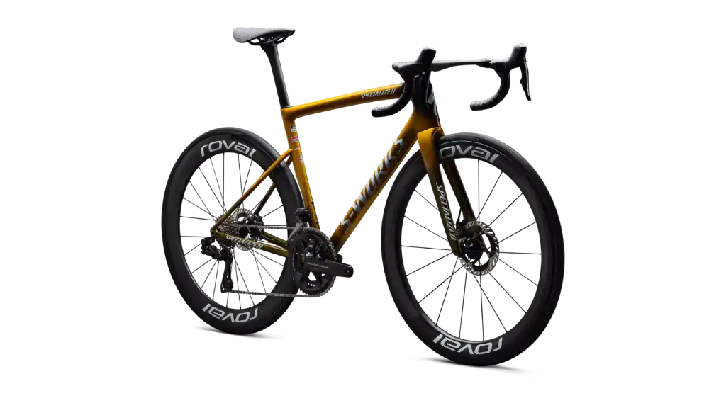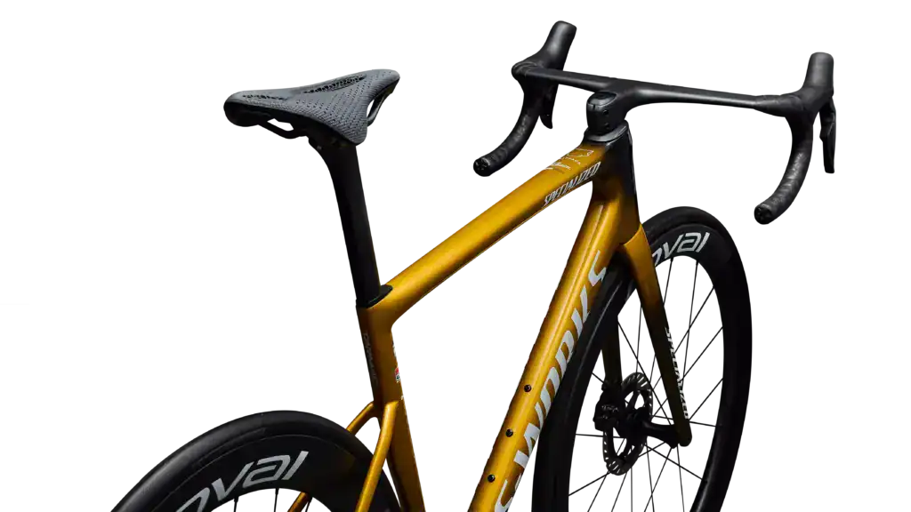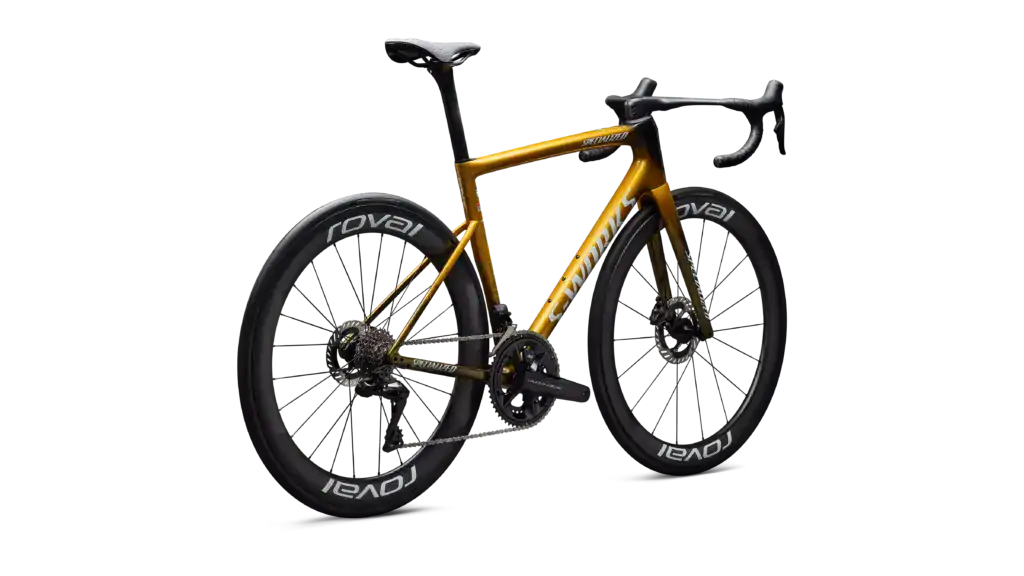 La Exclusive Golden S-Works Tarmac SL8 no es solo apariencia. Incorpora la máxima tecnología de Specialized y componentes WorldTour para ofrecer la bicicleta más rápida de la historia de la marca(Specialized España).