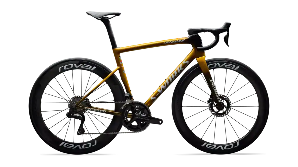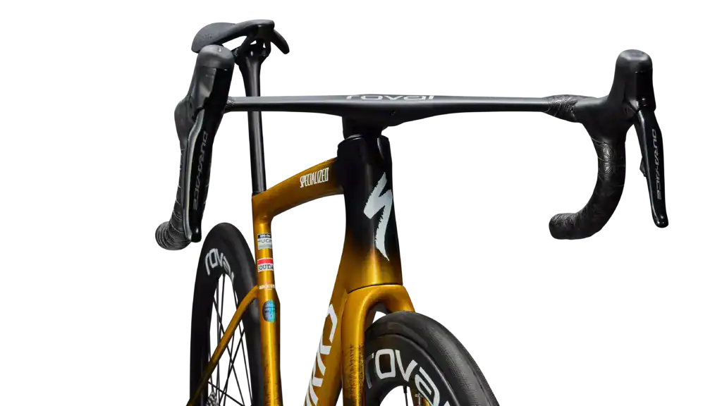 Esta edición “Golden” es la base de las bicis con las que Evenepoel y varios corredores de Soudal Quick-Step afrontan el Tour de Francia 2025 y las grandes vueltas. El setup es idéntico: ruedas Roval Rapide CLX III (algunas etapas), neumáticos S-Works Turbo Cotton o Rapidair, manillar Roval Rapide (ancho 38 cm en el caso de Remco para máximo control y aerodinámica), y bielas Dura-Ace 55/38T con medidor de potencia Shimano FC-9200P —incluso algunas versiones llevan platos CarbonTi dependiendo de la etapa.
