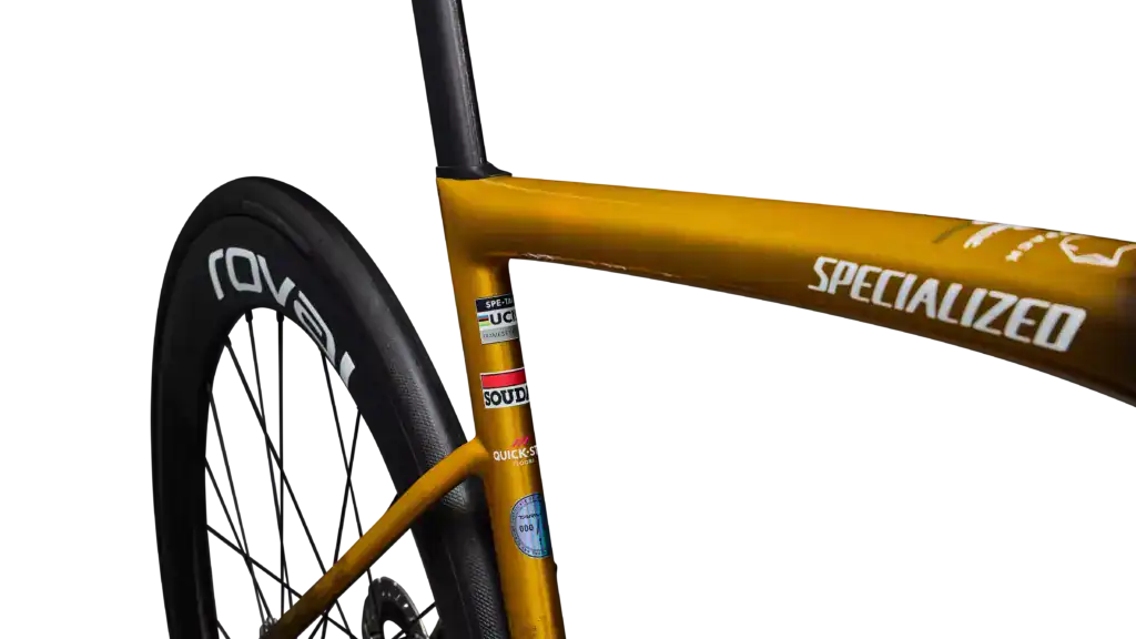 La Exclusive Golden S-Works Tarmac SL8 transpira exclusividad desde cualquier ángulo. Concebida en carbono FACT 12r con un proceso Rider First Engineered, su cuadro de 685 gramos presume del acabado dorado “Golden Season” acompañado de alusiones a los logros de Remco y el 50º aniversario de Specialized. Los gráficos del Soudal Quick‑Step, el logo “Wolfpack” y motivos conmemorativos se distribuyen con sutileza por el cuadro, la horquilla y el cockpit.