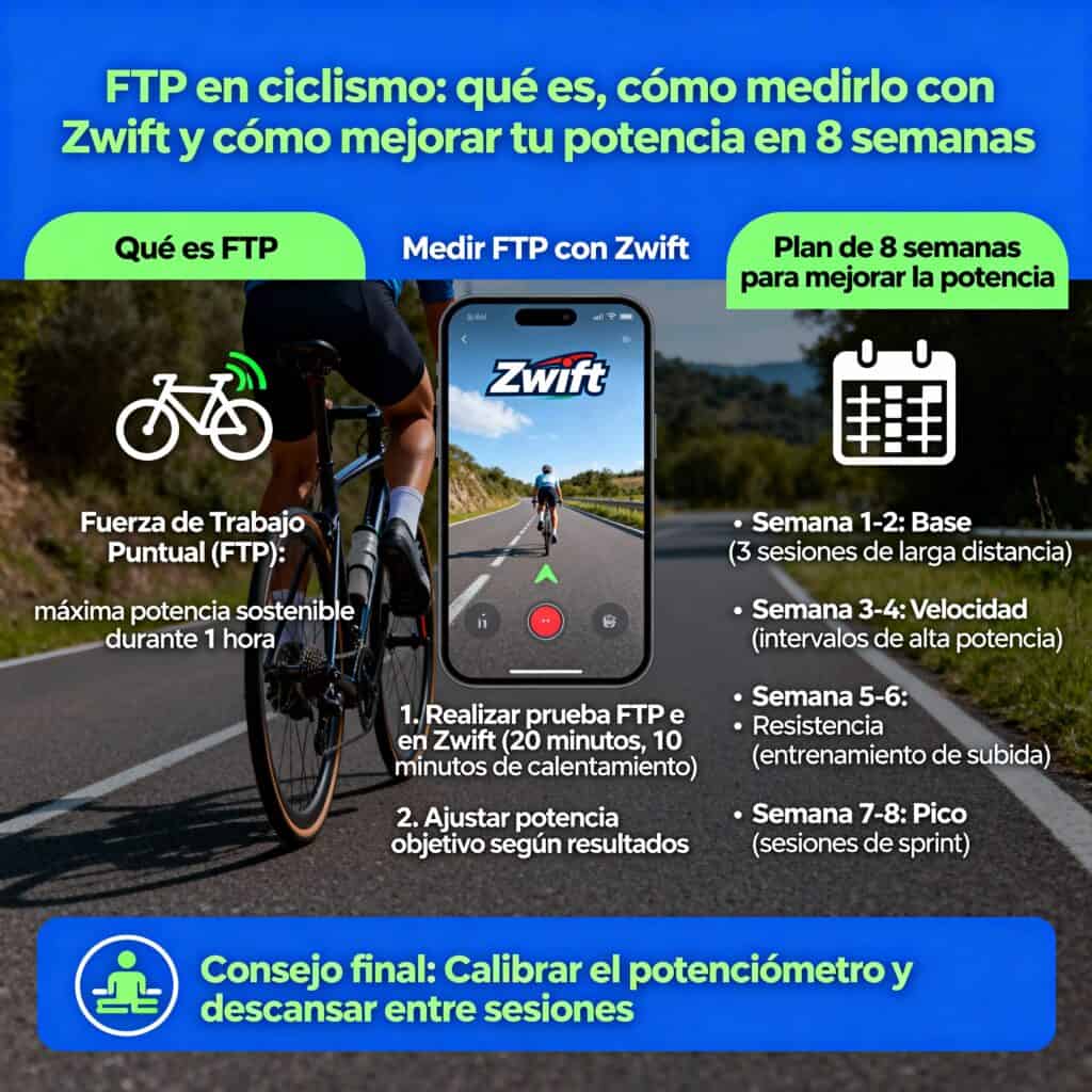 El FTP en ciclismo es la métrica que ha revolucionado la forma en que entrenamos, planificamos carreras y comparamos resultados. Si alguna vez te has preguntado qué significa ese número que aparece en tu pantalla de potencia, cómo obtenerlo de forma confiable o, sobre todo, cómo elevarlo en pocos meses, este artículo es para ti. A lo largo de las próximas secciones descubrirás la base fisiológica del FTP, los rangos “normales” según tu nivel, la manera más sencilla y precisa de medirlo con Zwift , y un plan estructurado de 8 semanas para subir tus vatios de forma sostenible.