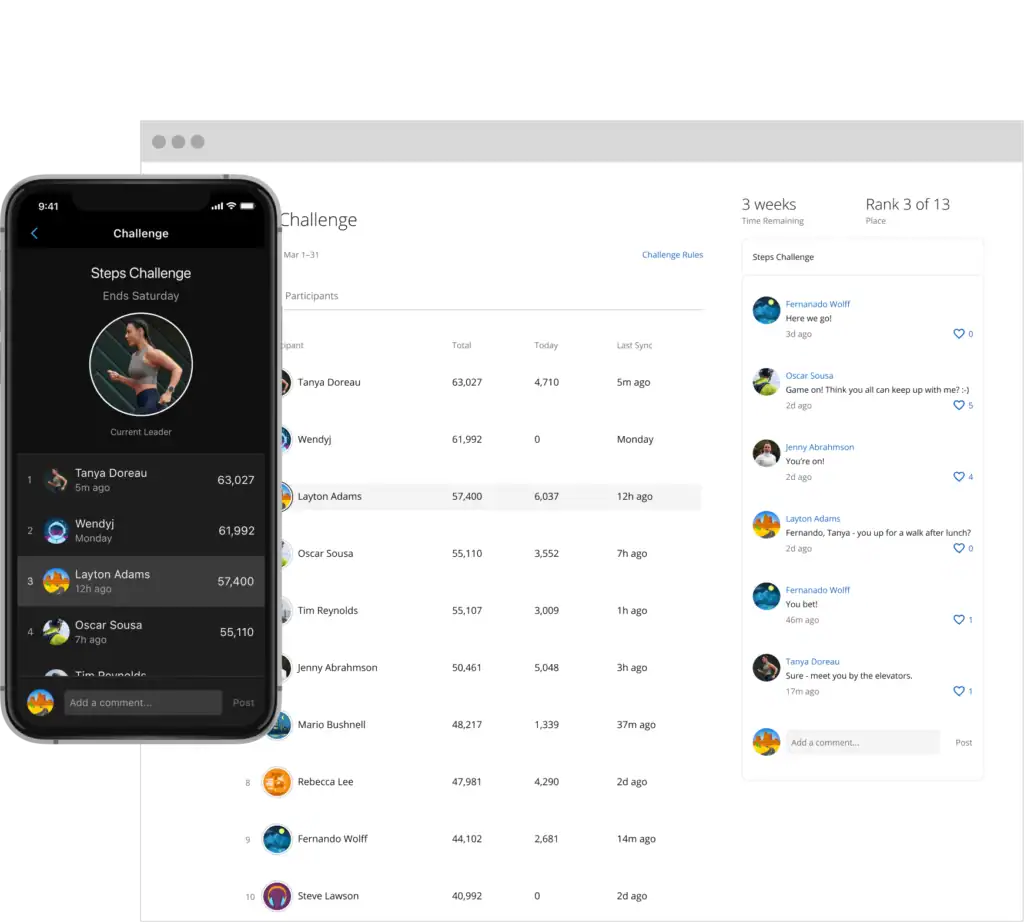 • Retos oficiales y personales para sumar pasos, distancias o actividades.