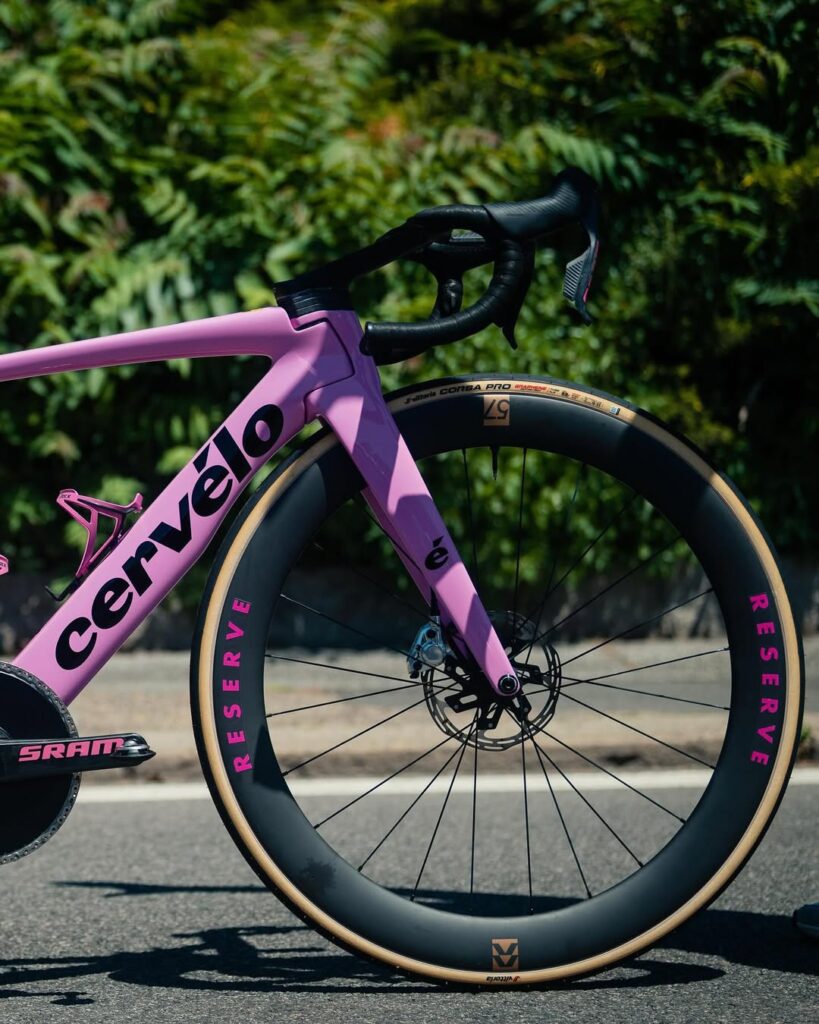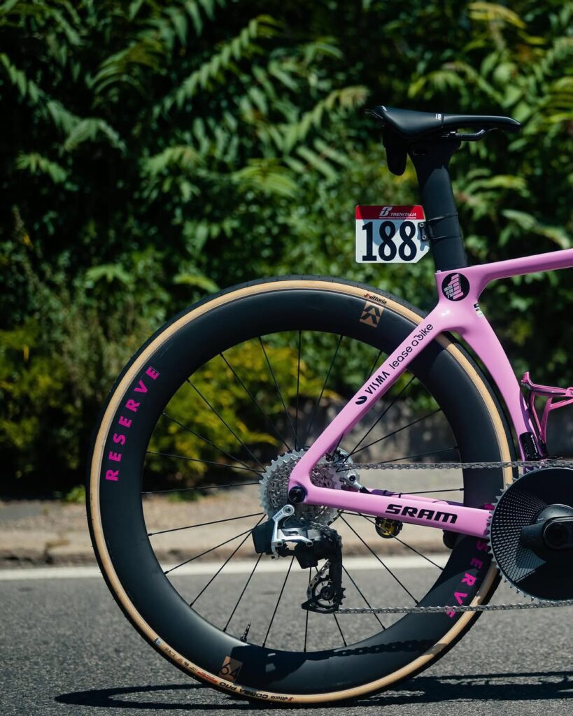 La ganadora del Giro estaba equipada con grupo SRAM Red AXS inalámbrico y ruedas Reserve de carbono ultraprofundas , adaptando el perfil (52/63 o 99 mm) al tipo de etapa.