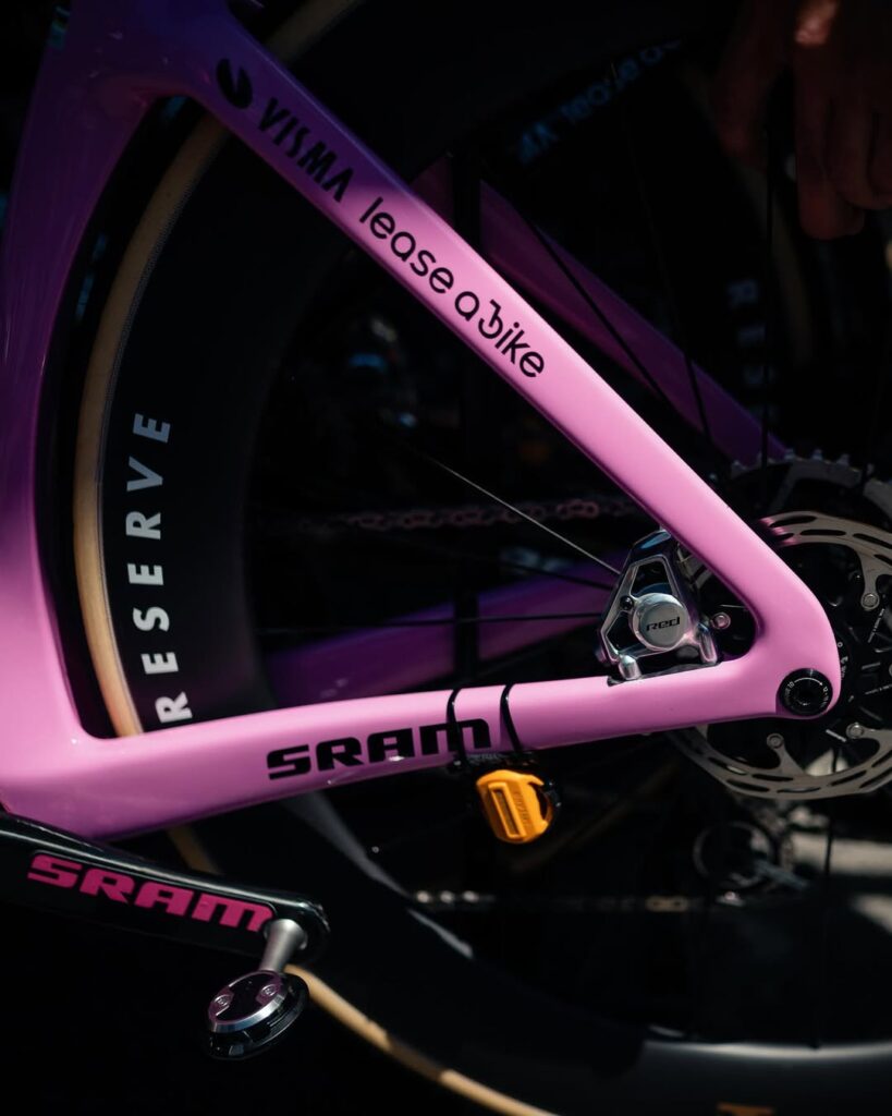 Simon Yates corrió con un Cervélo S5 de última generación, completamente personalizado para el equipo Visma-Lease a Bike, con pintura maglia rosa y componentes de máxima integración aerodinámica y electrónica.