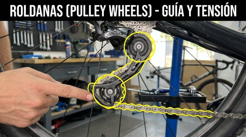 - Roldana superior o de guía : Se encuentra más cerca del cassette (los piñones traseros). Su función es orientar la cadena y guiarla con precisión hacia el piñón seleccionado.