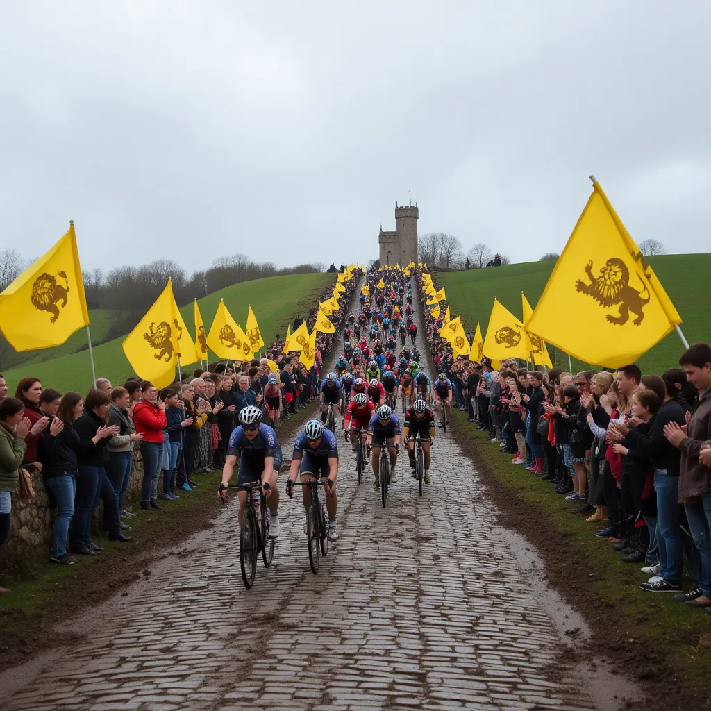 Durante las subidas, los aficionados belgas llenan ambas cunetas ondeando banderas amarillas con el león flamenco. Es una fiesta nacional: el día del Tour de Flandes, Bélgica se detiene.