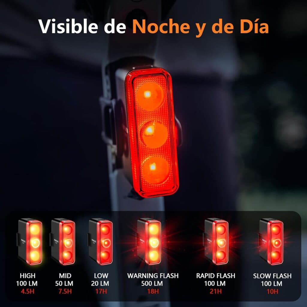El modo flash de advertencia sólo emite picos de los 500 lúmenes en ráfagas cortas, optimizando así la autonomía y evitando el posible deslumbramiento continuo. Para uso urbano diario o salidas largas, los modos de 50-100 lúmenes intermitentes aseguran plena visibilidad sin agotar la batería.