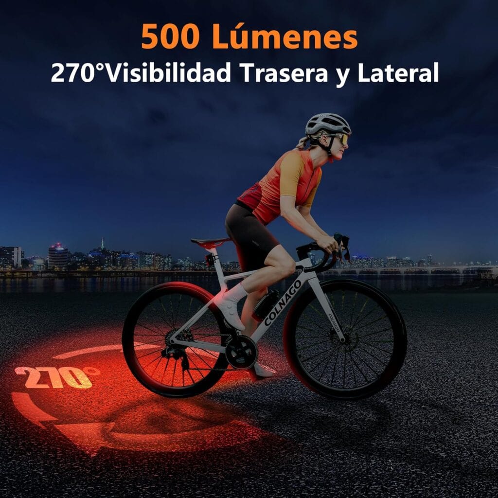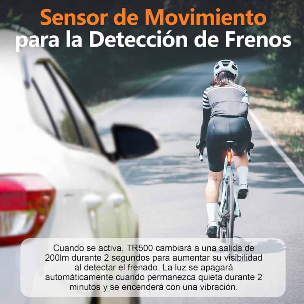 - Encendido/apagado automático: Si la bicicleta está parada durante 2 minutos, la luz se apaga sola; basta una vibración (al volver a montar) para que se reactive automáticamente. Ahorro de batería y cero olvidos.