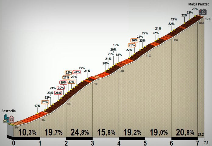 La Via Scanuppia, como se conoce la carretera que lleva a Malga Palazzo, es una auténtica salvajada para cualquier ciclista. Las cifras hablan por sí solas: