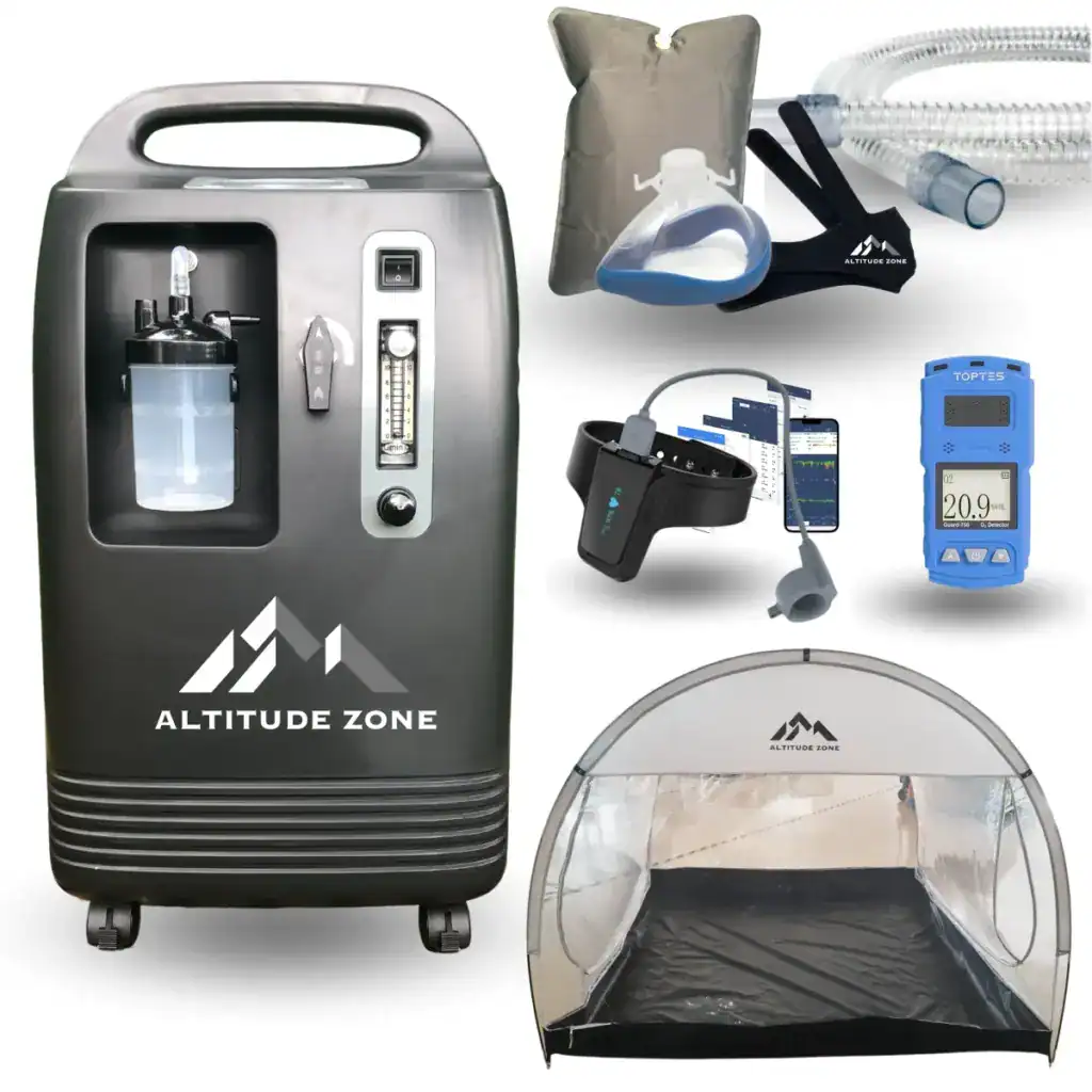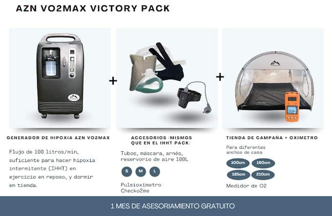 Diseñado para protocolos de hipoxia intermitente, el AZN VO₂max IHHT Pack simula altitudes de hasta 6.500 m. Permite sesiones tanto en reposo como durante el ejercicio. Su sistema modular se adapta a bicicletas, cintas o ergómetros, siendo una excelente opción para gimnasios especializados en ciclismo o triatlón.