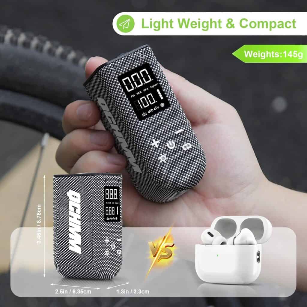 El diseño compacto es uno de los principales atractivos de esta mini bomba eléctrica. Con unas dimensiones de apenas 3,8 cm de ancho, 5,5 cm de largo y 9 cm de alto, y un peso muy ligero de solo 145 gramos, este inflador se convierte en un accesorio que no añade apenas carga a tu equipamiento. Su tamaño reducido facilita que el ciclista pueda llevarla sin esfuerzo en el bolso de sillín, en una mochila pequeña o en el propio bolsillo, permitiendo inflar las ruedas en cualquier lugar y momento.