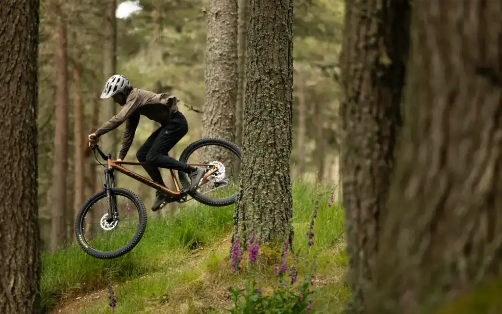 - Comportamiento bajando: La Laufey asombra por la confianza y aplomo que transmite pese a ser rígida. La combinación de geometría agresiva, horquilla de 140mm y cubiertas anchas permiten asumir líneas, cortados y raíces como si fuera una all-mountain doble, aunque exige más técnica en tramos muy rotos.