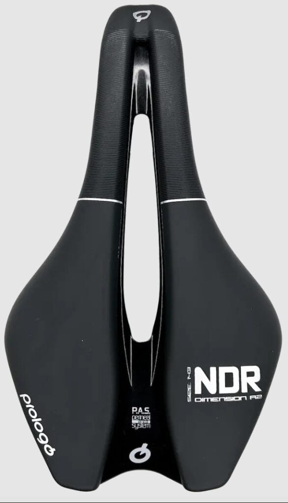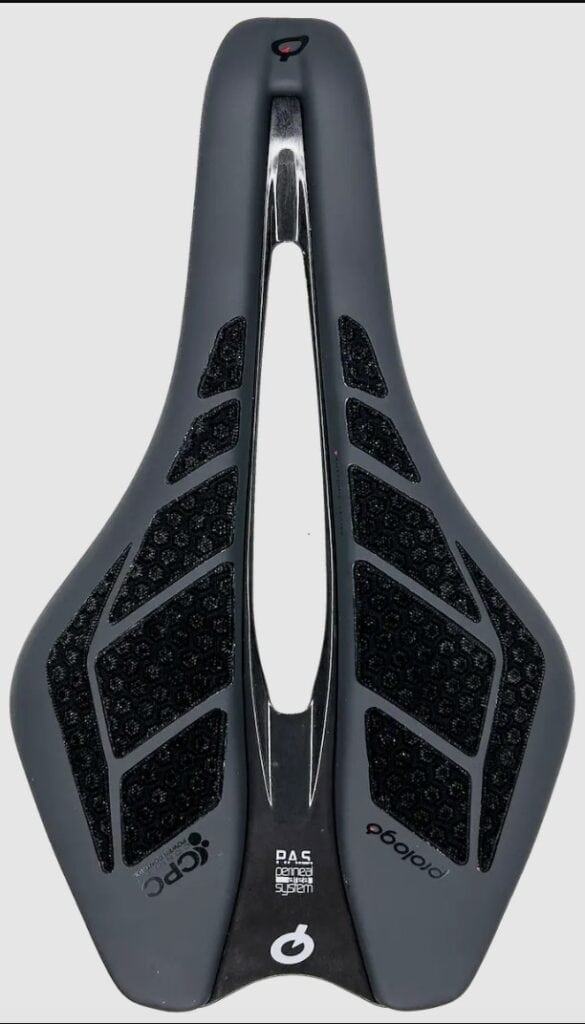 - El canal PAS central, tan característico de Prologo, unido al acabado ventilado y antideslizante, elimina la molesta sensación de zona húmeda y evita rozaduras incluso en condiciones extremas.