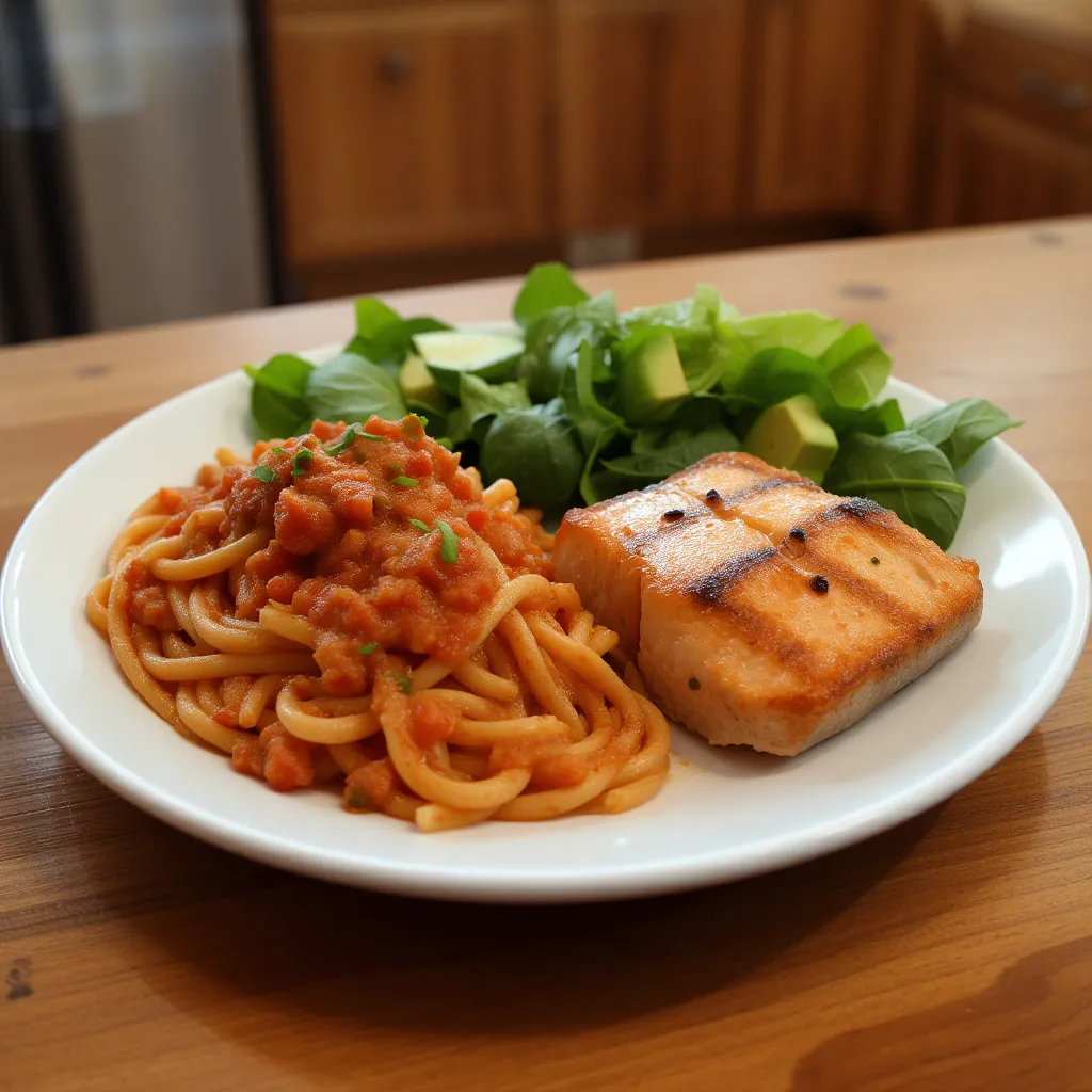 Sábado (carrera)Porridge + fruta + whey (250 g carbs)(N/A) – se come en la carreteraGel + barra + fruta cada 30 minCena: pasta con salsa de tomate, salmón, vegetales, postre