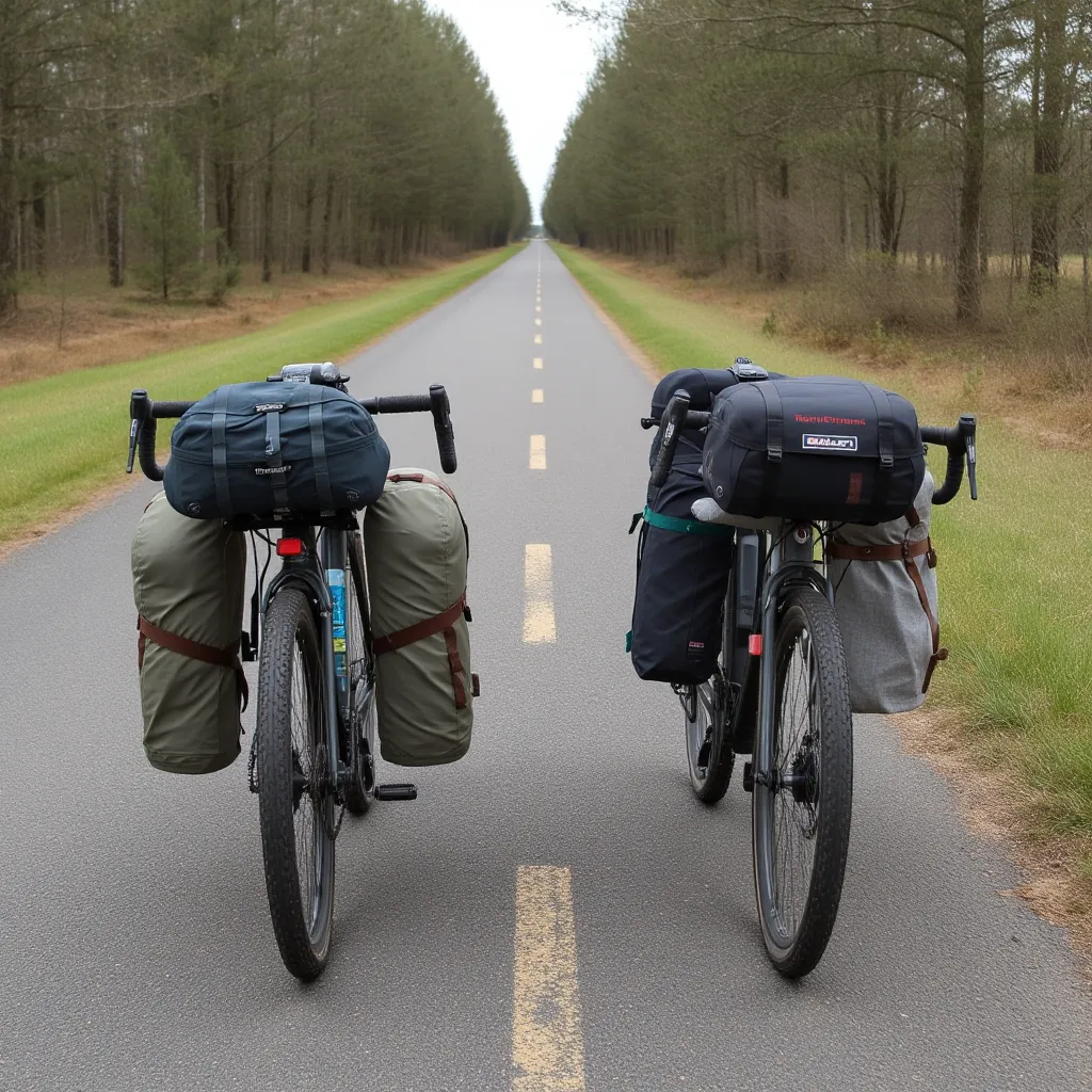 | Equipaje | Bolsas compactas y ligeras fijadas al cuadro, manillar y sillín | Alforjas grandes montadas en portaequipajes |