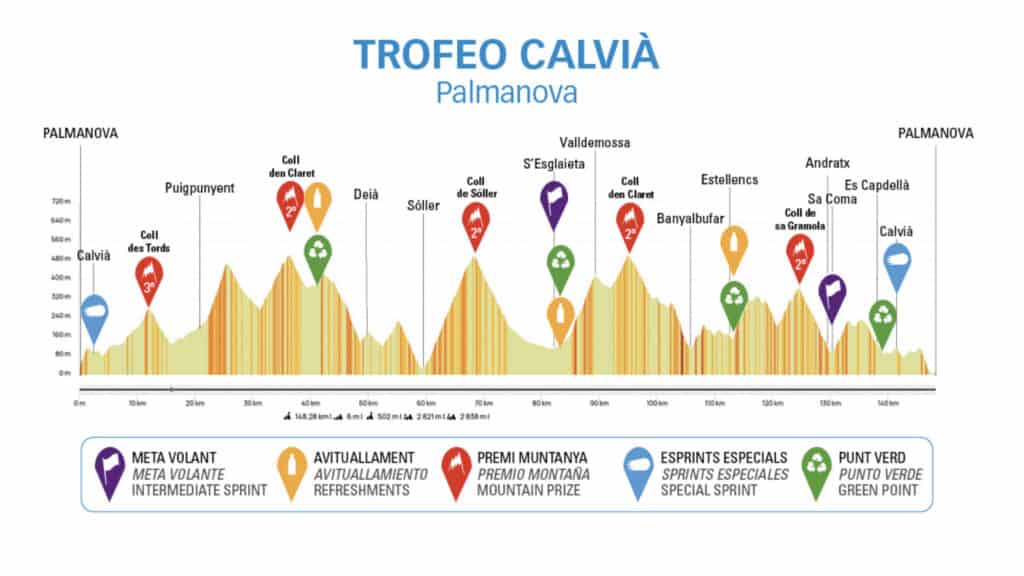 El Trofeo Calvià se disputa el 28 de enero con salida y meta en el paseo marítimo de Palmanova, en la zona de Calvià. El recorrido de 148,5 km es una mezcla de carreteras costeras y subidas medias que favorecen a los puncheurs y a los sprinters que pueden sobrevivir a los picos de altitud. El punto clave es el Coll de Sóller, una ascensión de 8,4 km con una media del 5,5 % que se sitúa a mitad de carrera y suele ser decisiva para romper el pelotón. Después del col, el circuito vuelve a descender y sube de forma intermitente, ofreciendo oportunidades para ataques a corta distancia.