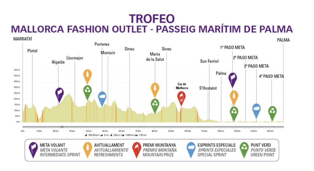 El domingo 1 de febrero se celebra el Trofeo Palma, la única prueba sin recorrido publicado en detalle, aunque se sabe que cubrirá 158,3 km con salida en el Mallorca Fashion Outlet (Marratxí) y llegada en el Paseo Marítimo de Palma. El perfil está pensado para los sprinters, con tramos planos y pocas subidas significativas, lo que garantiza una llegada masiva.