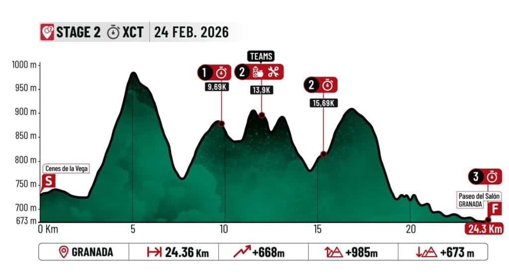 La segunda jornada adopta formato XCT (contrarreloj individual), una de las grandes novedades de 2026 (Andalucía Bike Race 2026 Novedades).