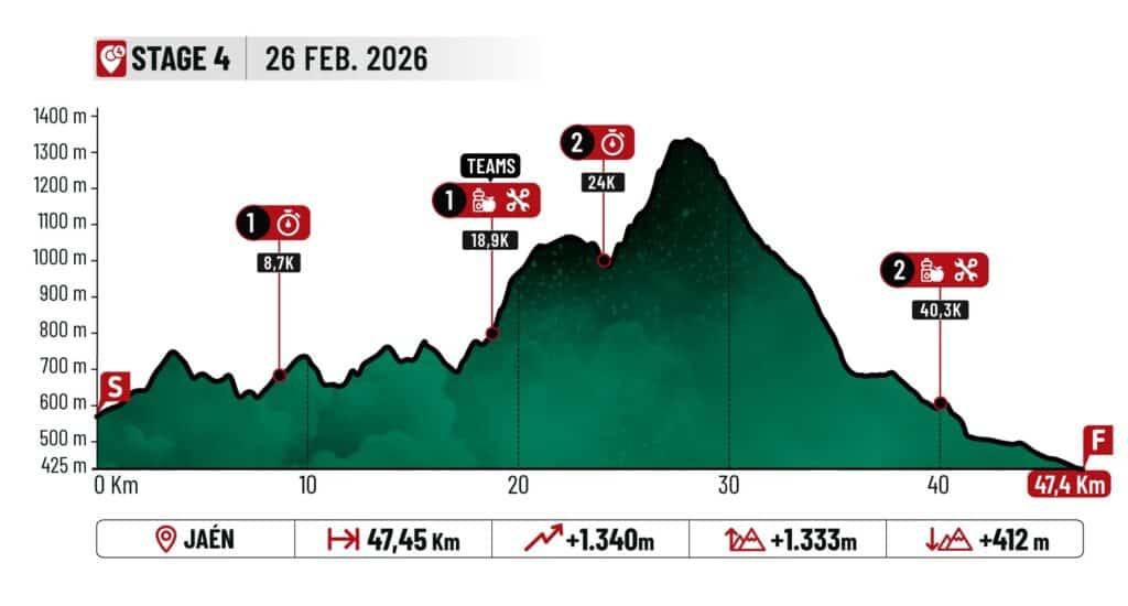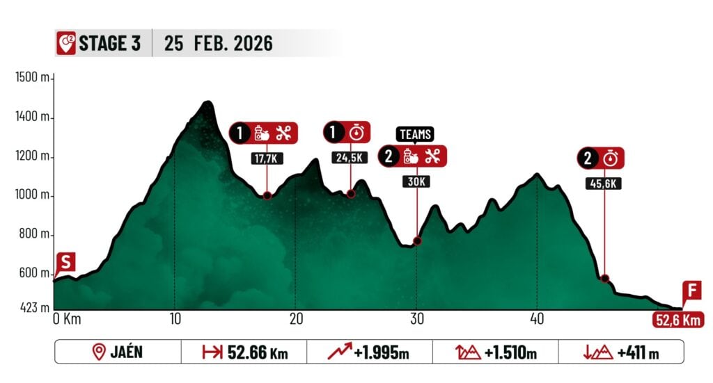 El gran reto de la jornada será una ascensión acumulada de cerca de 600 metros positivos, denominada “la reina” del día. Los últimos kilómetros se endurecen por la Sierra del Neveral, antes de la llegada triunfal al Olivo Arena, donde estará ubicada la meta.
