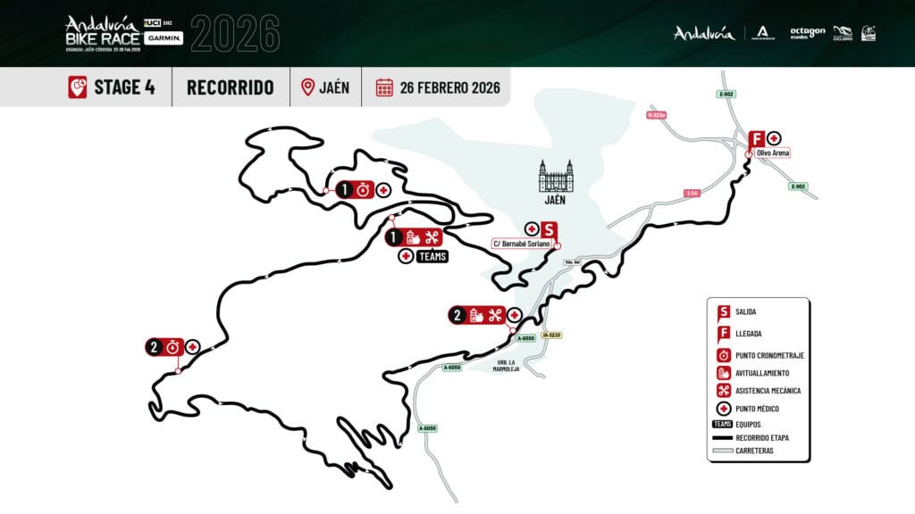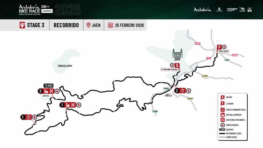 La etapa arranca con una subida larga hasta el Jabalcuz, por pistas rotas que exigen buena gestión del ritmo. Le sigue un descenso técnico hasta La Solana, y un tramo intermedio de senderos estrechos, subidas explosivas y pasos de roca, todo rodeado del mar de olivos típico de la provincia.