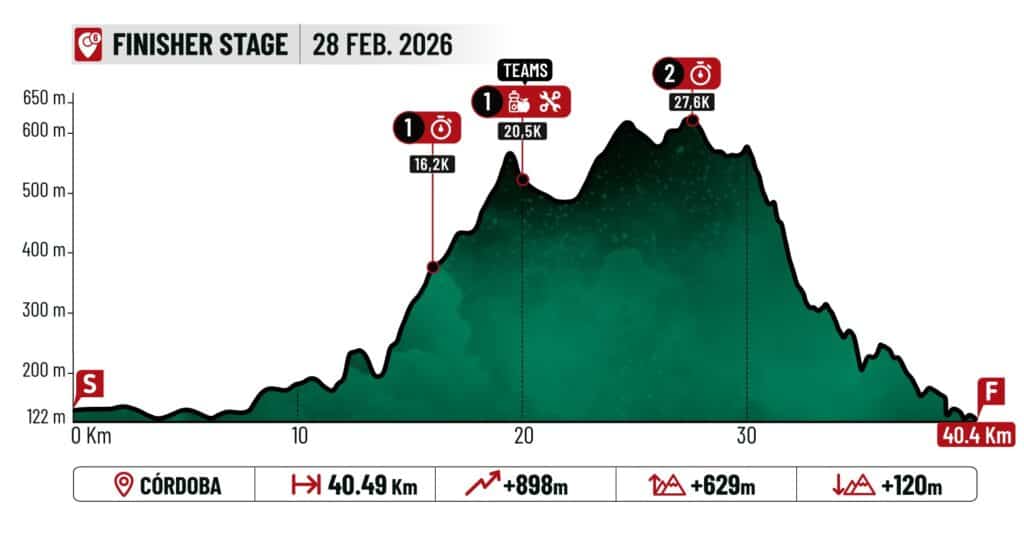 La sexta etapa cierra la edición 2026 con un formato explosivo de estilo XCO, en el que la técnica y la estrategia serán determinantes. El recorrido enlaza rápidamente con la Vereda de La Alcaidia rumbo a Linares, para ascender la famosa Loma de los Escalones atravesando el mítico tramo del Arrastraculos, uno de los puntos más exigentes de Córdoba.