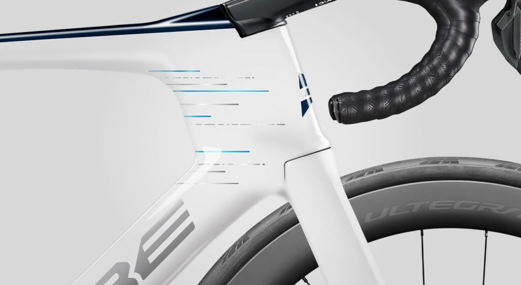 Gracias a esta combinación de fibras, la Dare VA-AFO S8 rebaja 100 gramos respecto a su predecesora VSRu, sin comprometer ninguna prestación estructural. El resultado es un cuadro extremadamente rígido y ligero, preparado para soportar las potencias máximas de los sprinters y las demandas aerodinámicas de las etapas más rápidas.