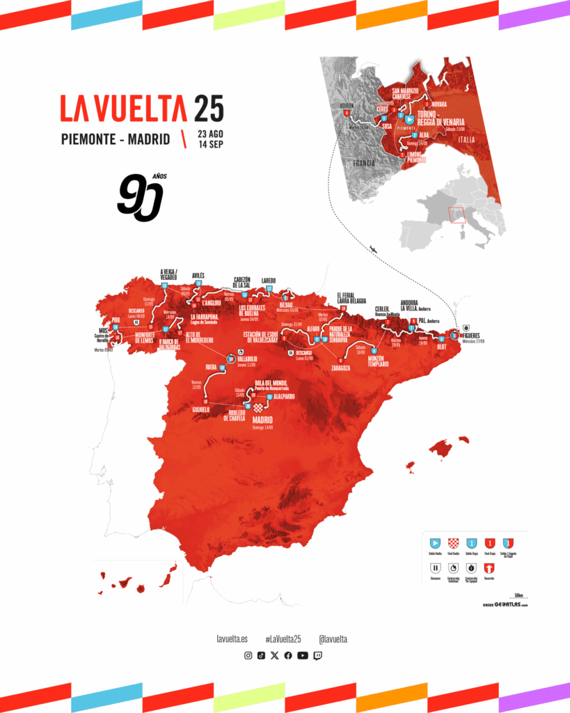 El recorrido de la Vuelta ciclista a España 2025 se distingue este año como uno de los más duros y técnicos de su historia reciente. La carrera partirá el 23 de agosto en Turín (Italia) y finalizará el 14 de septiembre en Madrid, tras 21 etapas y más de 3.100 km, casi todos en la mitad norte de la península ibérica, con escaso protagonismo para el sur y las etapas completamente llanas.
