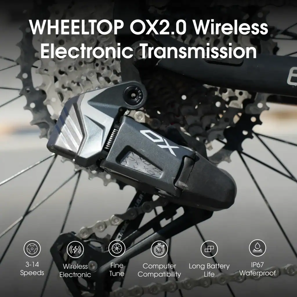 Tanto el cambio como el mando del WHEELTOP OX 2.0 funcionan de forma 100% inalámbrica, lo cual permite una instalación limpia y sin cables visibles. Esto no solo mejora la estética de la bicicleta, sino que simplifica el mantenimiento y elimina la necesidad de ajuste de tensores.