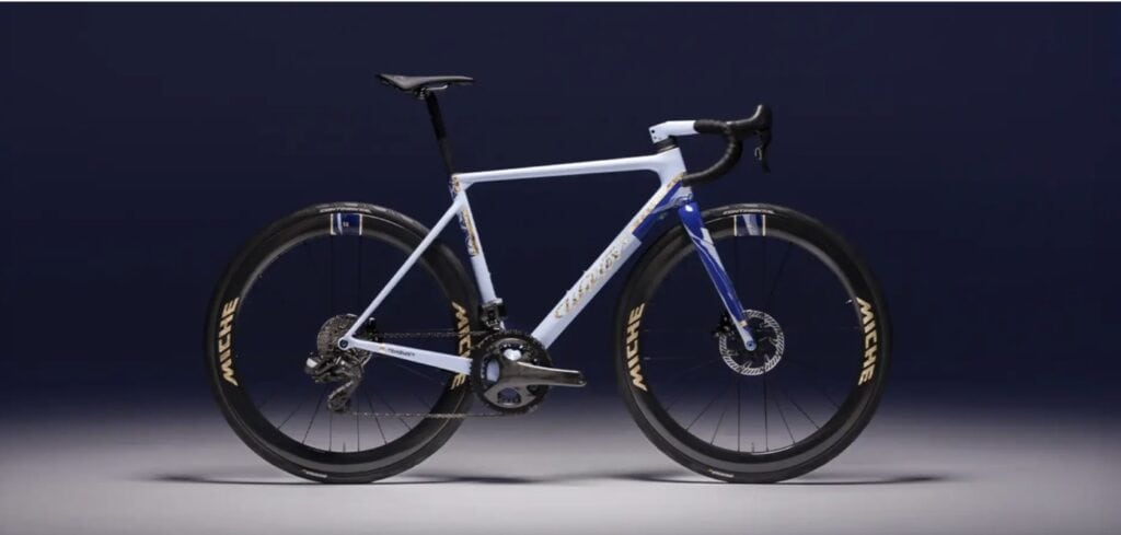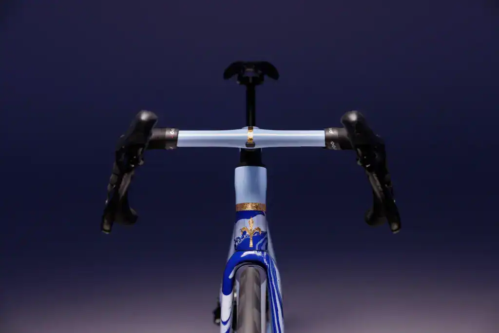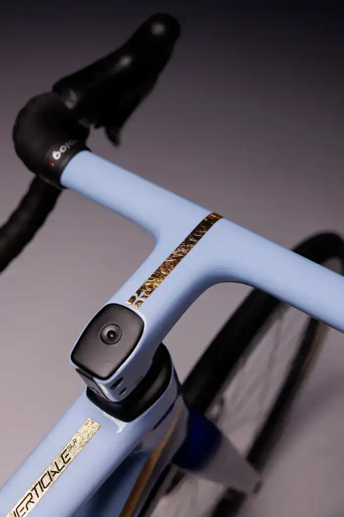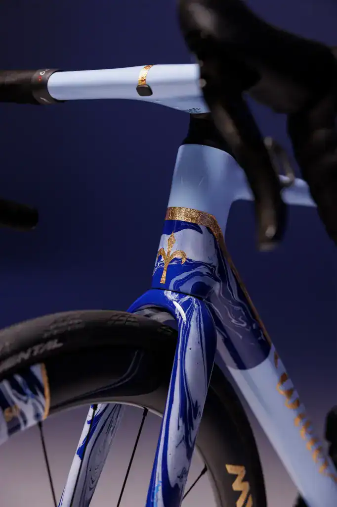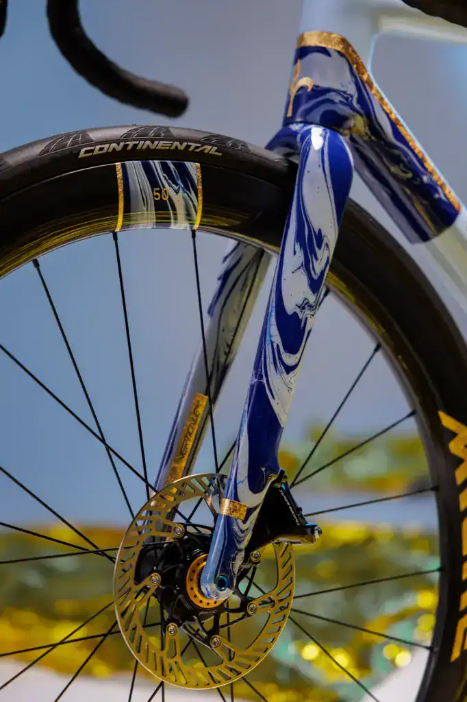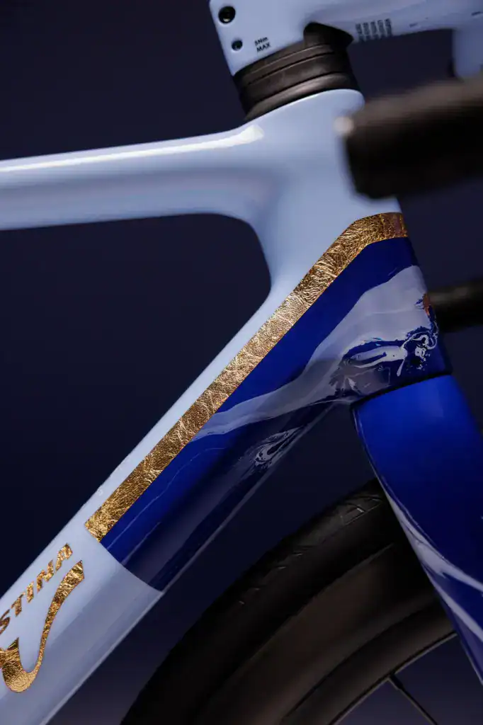 Wilier ha optado por un esquema de color en el que el azul representa la fluidez y elegancia del agua, mientras que el oro añade luz y esplendor a los detalles estructurales. Este contraste no solo es visualmente impactante, sino que también expresa la filosofía estética contemporánea de la marca italiana: la pintura deja de ser un simple acabado y se convierte en un elemento vertebral del proyecto y de la identidad de la bicicleta.