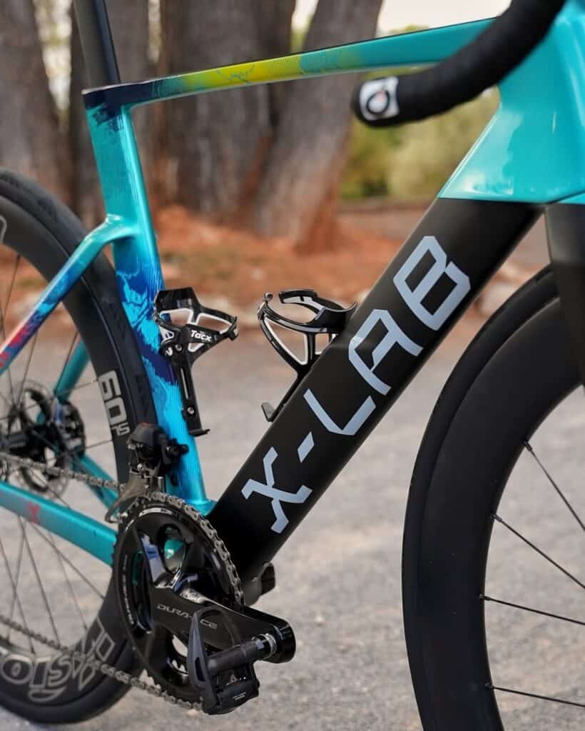 Uno de los atractivos evidentes de la X-LAB AD9 es su diseño impactante. Hereda la tradicional paleta azul del Astana Team, ahora con detalles eléctricos en rojo y amarillo que evocan la nueva era auspiciada por los patrocinadores chinos. Los acabados integran el logotipo "xlab" en la parte baja del tubo diagonal y un color negro intenso en elementos como la horquilla y la trasera, dotando a la bicicleta de una presencia única en el pelotón.