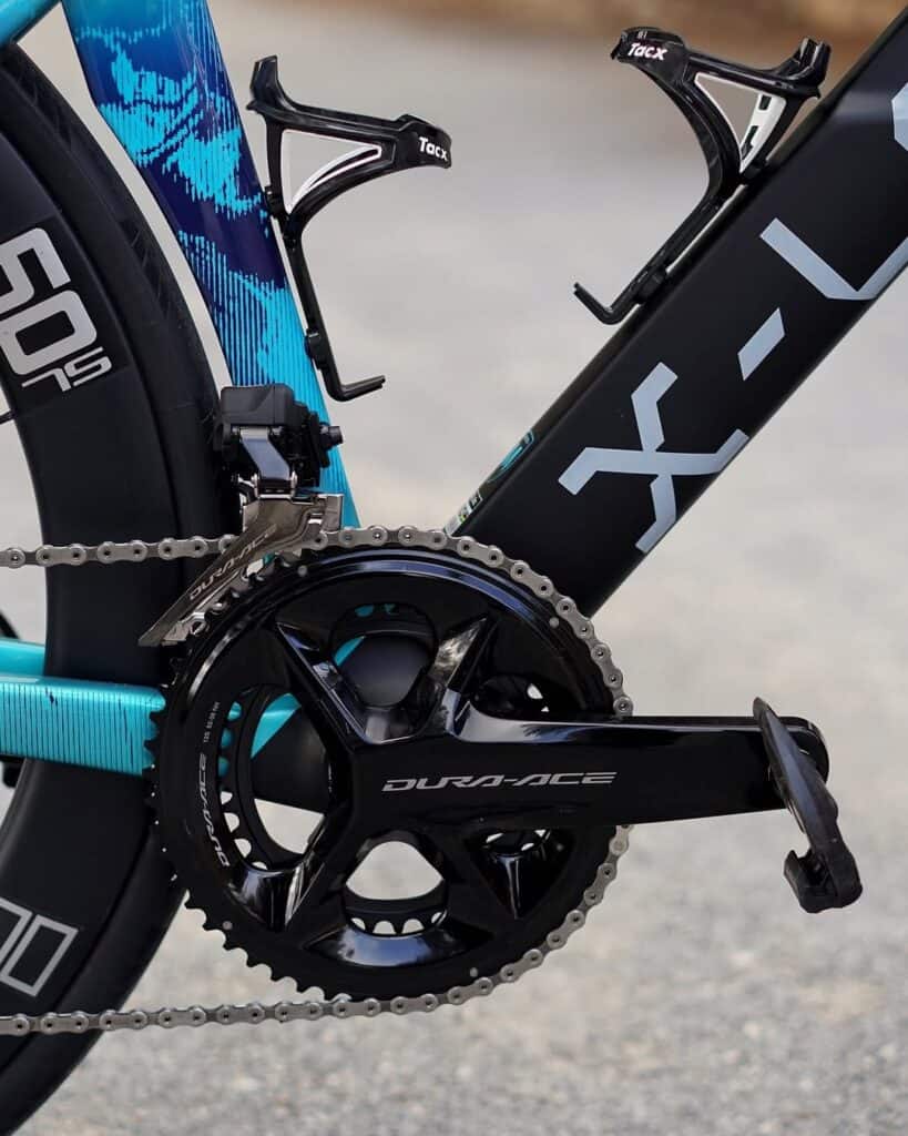 • Transmisión: Shimano Dura-Ace Di2 electrónico de última generación, con bielas 170 mm seleccionadas por los corredores para máxima eficiencia.