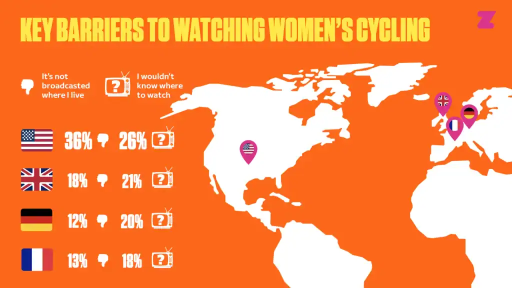 En Estados Unidos, solo el 6 % de las personas afirma seguir el ciclismo femenino, en comparación con el 12 % en Francia. Al profundizar en las razones, ante la pregunta "¿Por qué no ves carreras de ciclismo femenino?", el 36 % de los encuestados en EE. UU. respondió "No se transmite donde vivo", una cifra muy superior a la del Reino Unido (18 %).