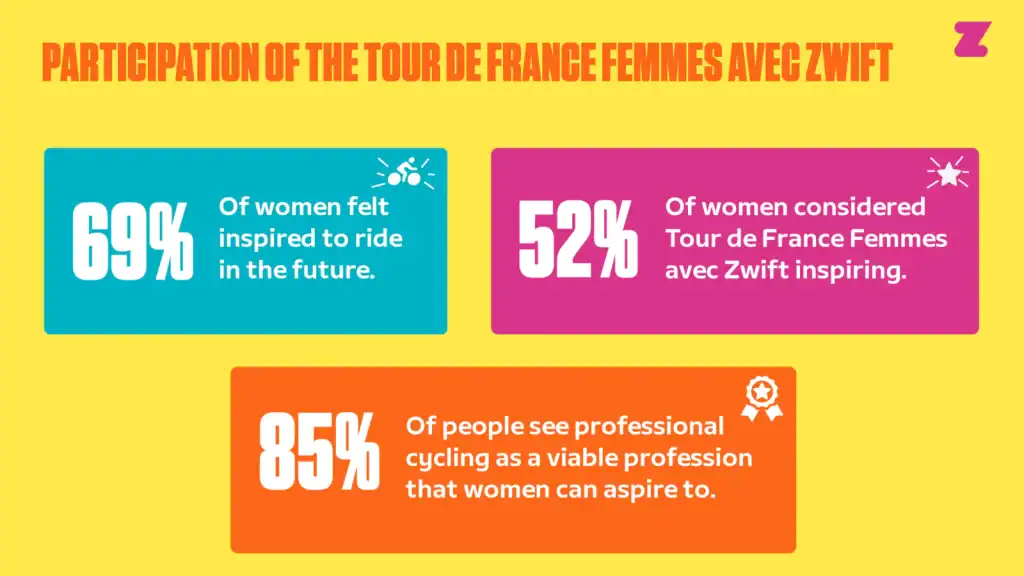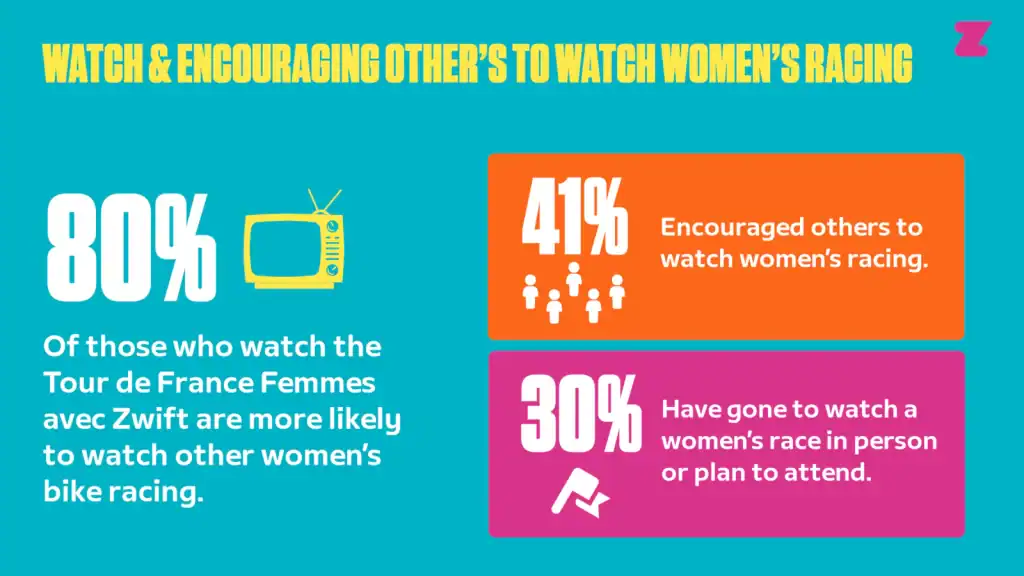 De quienes siguieron el Tour de France Femmes avec Zwift, el 61 % dijo sentirse inspirado a querer pedalear más, cifra que sube al 69 % entre las mujeres.